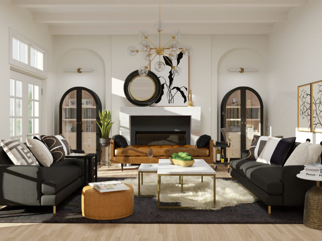 Experience the allure of modern glamour with a living room interior design that exudes sophistication and opulence. Luxurious fabrics, metallic accents, and statement lighting fixtures add drama and flair to the space. Incorporate reflective surfaces like mirrored furniture and glass accessories to enhance the sense of glamour and elegance. Choose a bold color palette and incorporate plush textiles to create a sense of indulgence and luxury.